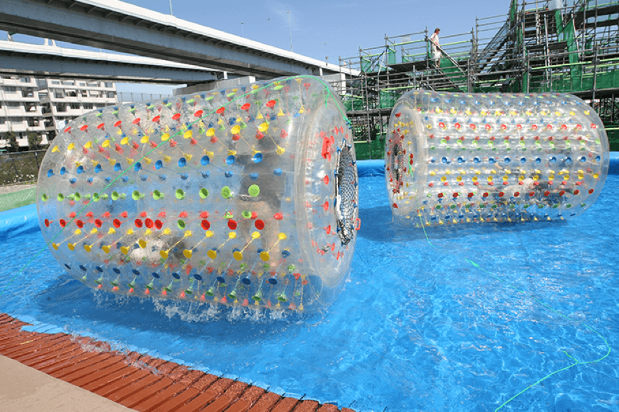 巨大風船に入り、1人でもみんなでも水上歩行を楽しめるアトラクション。実際に体験しているお客さんの多くが何度も転んでいましたがとても楽しそうにしていました。コントロールする難しさと、楽しさを兼ね備えたアトラクションです。